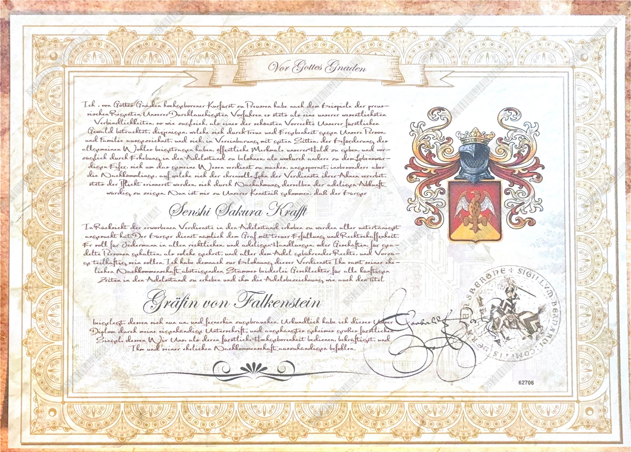 Mir wurde der Titel "Gräfin von Falkenstein" im Jahr 2018 verliehen – als Würdigung meines langjährigen ehrenamtlichen Engagements, meiner mildtätigen Haltung und meines beständigen Wirkens für eine werteorientierte Gesellschaft.